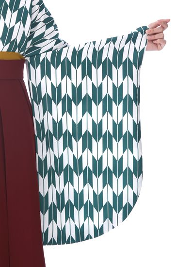 大正ロマン風の矢絣コーデさわやかな緑の矢絣に、エンジ色の卒業袴を合わせたレトロモダンなセットです。